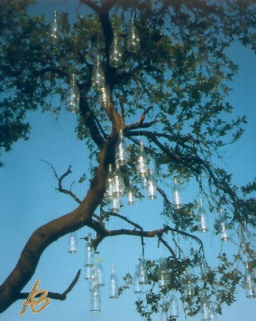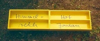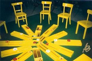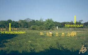 Reihe oben, links und Mitte: "Jeder hat einen Wunsch frei" Installation mit 12 Stühlen, 34 Wunschkästen und einem (Freuden)-Tränenbaum; unten links: "jeder hat einen Wunsch frei", Detail Wunschkästen; unten rechts:der (Freuden)-Tränenbaum