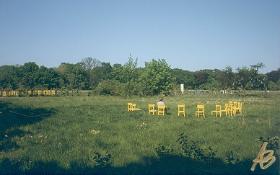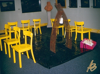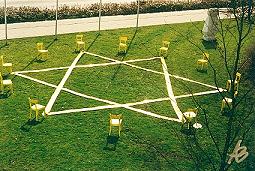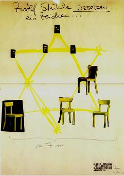 "12 Stühle besetzen ein besetztes Zeichen", Installation zum BBK-Projekt "besetzt"; rechts: Skizze dazu