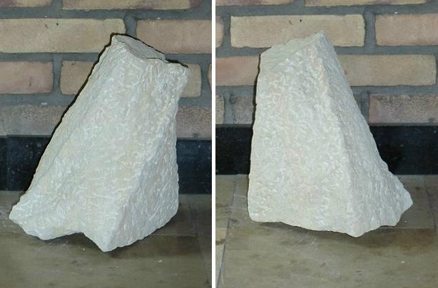 Sandstein von 18 auf 13 Kilogramm heruntergeklopft, außerdem habe ich die Seitenwände um 45° gegen den Uhrzeigersinn gedreht. Bearbeitung mit grober Spitze.
